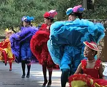 Can-Can dresses were historically worn during the can-can dance. Whilst the actual items of clothing can vary, but the general style of clothing remains the same. The main idea is that the dresses should be full of frills and ruffles and be multilayered. In one interpretation, designed for a play that was set in the 1890s, the cancan dresses were "in different colours with lots of ruffles and frills on their petticoats and pantalette style underwear... fishnet stockings with ruffled garters". The cancan outfit can also be adorned with some or all of the following accessories: ankle boots, hats, gloves, capes, shawls, wraps, boas, jewelry and feathers.[1] Traditionally, women commonly wore split knickers in their outfit.[2]