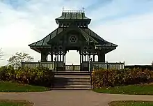 The memorial is primarily a reconstruction of the Summer Pavilion, a gazebo built for the Speaker of the House of Commons in 1877 by Thomas Seaton Scott and demolished in 1956.[2][1] Called the Police Memorial Pavilion, the reconstruction is located behind the Parliament Buildings on the northwest corner of the Parliament Hill grounds, overlooking the Ottawa River.[1][6]
