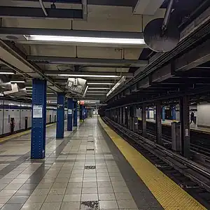 The walls of the station contain cobalt blue tile bands[31] with darker blue borders.[32] Since Canal Street is an express station, it has a wider tile band than local stations.[32] The tile colors are intended to help riders identify their station more easily, part of a color-coded tile system for the entire Independent Subway System.[31][32] The tile colors were designed to facilitate navigation for travelers going away from Lower Manhattan; on the Eighth Avenue Line, the tiles change color at the next express station to the north. As such, the blue tiles used at the Canal Street station were also used on Spring Street, the local station to the north; the next express station, West Fourth Street, used a different tile color.[33][34]