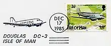 Other post offices such as the Isle of Man Philatelic Bureau also create special pictorial cancellations as they did in 1985 to mark the anniversary of the aircraft Douglas DC-3. A special handstamp was created [19] depicting a Dakota flying "free" and not "boxed in".[20]