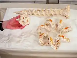 Completed toroidal coil sculpture, along with a model of a wood screw and a small dodecahedron. Each of these objects was fabricated out of pure sugar.