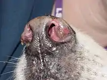 Discoid lupus erythematosus (DLE) is an uncommon autoimmune disease of the basal cell layer of the skin. It occurs in humans[1] and cats, more frequently occurring in dogs. It was first described in dogs by Griffin and colleagues in 1979.[2][3] DLE is one form of cutaneous lupus erythematosus (CLE). DLE occurs in dogs in two forms: a classical facial predominant form or generalized with other areas of the body affected. Other non-discoid variants of CLE include vesicular CLE, exfoliative CLE and mucocutaneous CLE.[4] It does not progress to systemic lupus erythematosus (SLE) in dogs. SLE can also have skin symptoms, but it appears that the two are either separate diseases.[5] DLE in dogs differs from SLE in humans in that plasma cells predominate histologically instead of T lymphocytes.[6] Because worsening of symptoms occurs with increased ultraviolet light exposure, sun exposure most likely plays a role in DLE, although certain breeds (see below) are predisposed.[7] After pemphigus foliaceus, DLE is the second most common autoimmune skin disease in dogs.[8]