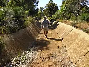 The Canning Contour Channel is a 16 kilometres (9.9 mi) series of man-made concrete channels and steel and cast-iron pipelines in the Darling Scarp in Western Australia constructed between July 1935 and December 1936.[1] The project was a Depression era public works scheme to carry potable water from just below Canning Dam through the hills around and above Roleystone and Kelmscott to a screening, fluoridation and pumping station near Gosnells by following the natural contours of the Canning Valley—hence it was entirely gravity-fed. Where a tributary valley needed to be crossed, suspended or siphoning pipelines were used. From Gosnells, the water entered the city's pipeline distribution system.
