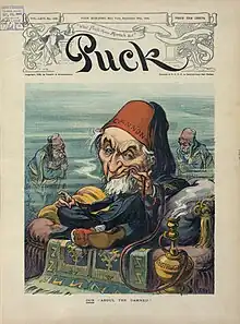 During the 1908 campaign, Cannon came under heavy fire from the press, which denounced him as a tyrant and obstacle to every piece of progressive legislation introduced in the prior thirty years. One cartoon depicted him as the "Unrepentant Defendant" in the court trial of "Predatory Wealth" for its victimization of "The Common People."[5] For his part, Cannon attributed the newspaper opposition to his refusal to support Roosevelt's proposal to permit the duty-free importation of newsprint and wood pulp, as well as his very first House bill which passed the cost of magazine and newspaper subscriptions to publishers.[5]