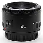 The EF 50mm lenses are a group of normal prime lenses made by Canon that share the same focal length. These lenses are based on the classic double-Gauss lens,[1] with the f/1.8 being a standard six-element double-Gauss with an air gap and powers between element 2 and 3[1] and its faster cousins adding additional elements.[2] The 50mm focal length, when used with a 35mm film or full-frame sensor, has been widely considered to match the perspective seen by the human eye.[3]