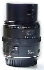 The EF50mm f/2.5 Compact Macro is a relatively inexpensive macro lens with a minimum focusing distance of 23 cm (9 inches) offering a maximum magnification of 0.5x actual size.[8] Reviewers describe the lens as having "decent"/"mid-level" build quality, with very good color and contrast, "absolutely negligible" distortion, very sharp after f/4 and peak performance at f/5.6. However, auto-focusing is relatively slow and noisy.[11][12]