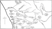 The objective of the British August offensive was to seize Chunuk Bair, a high point in the Sari Bair mountain range. The New Zealand and Australian Division would provide the attacking force. The initial attack was to clear the Turks from the foothills; this task was given to the New Zealand Mounted Rifles Brigade, reinforced by the Maori Pioneer Battalion. The regiment, together with the Otago Mounted Rifles, was to clear Chailak Dere valley, then advance to Aghyl Dere in the north. They also had to capture Taylor's Hollow and Walden's Point, then turn east to capture Beauchop Hill. To reduce noise and maintain stealth, they were ordered to use only their bayonets.[35] At 20:00 on 5 August, the 296 men of the regiment moved forward to No.2 Post in preparation for the attack, which was due to start at 21:00 the next night.[36] Their assault started on time, with the 1st and 10th Squadrons forward, followed by the 8th Squadron and Machine-Gun Section in reserve. The leading men met and killed four Turks in an observation post. Then with still around two hundred yards (180 m) to go, a destroyer's searchlight beam lit up the advancing men, and a Turkish machine-gun opened fire on them. The 10th Squadron charged straight into the Turkish trench, while the 1st Squadron managed to manoeuvre around and attack the machine-gun from the rear. They achieved this without firing a shot or making a sound, and then advanced towards their last objective, Beauchop Hill. The hill was also captured, and the survivors started to dig in.[37] Although it had taken all its objectives, the regiment had around forty per cent casualties, including the commanding officer, who was wounded, and the second in command, Major Overton, who had been killed.[38] While digging in they were able to observe the rest of the battle, which did not seem to be going well. By the next day, 7 August, Turkish reinforcements were arriving at Chunuk Bair and the attack had failed. Since the start of the battle they had lost twenty-four men dead and sixty men wounded.[33][39] Now commanded by Major Hutton, from the 10th Squadron, the regiment remained on Bauchop Hill in defence until 15 August, when they moved back to the entrance of Aghyl Dere, then later moved forward two hundred yards (180 m) and occupied an old Turkish trench.[40]