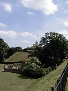 In other parts of Canterbury, the city walls became used for promenades by the more fashionable citizens.[88] The Dane John Gardens were built between 1790 and 1803 by Simmons in the south-east corner of the walls, remodelling the old castle motte, and incorporating the Roman bank and the medieval wall-walk into the design.[89] The ownership of the land was disputed, and the park was taken into the control of the city shortly after its construction.[90]
