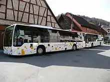 There are several regional bus services that link towns and villages in the canton of Schaffhausen with each other or with towns in the adjacent canton of Zurich and nearby German territory, respectively. Bus services 21–25 and lines 630 and 634 (the latter two to villages in the northern part of canton of Zürich) all depart from the forecourt of Schaffhausen railway station in Schaffhausen. In addition, bus line 33 (7349) connects villages in the eastern part of the canton of Schaffhausen with Singen (Hohentwiel) (some courses continue to Konstanz) in Germany.[18] Line 675[19] connects the villages of Rüdlingen and Buchberg in the southern part of the canton of Schaffhausen with Rafz and Henggart (both are in the canton of Zürich), respectively. Route 825 links Stein am Rhein in the eastern part of the canton of Schaffhausen with Frauenfeld, the capital of the canton of Thurgau. Lines 21–25 and 27–28 are operated by Verkehrsbetriebe Schaffhausen (vbsh),[20] while routes 630, 634, 675 and 825 are operated by Postauto, and line 33 (7349) is run by Südbadenbus.