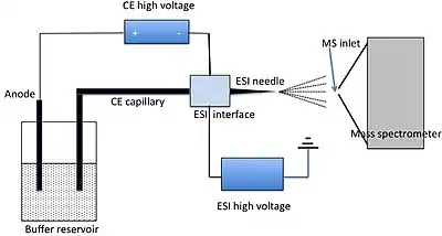 Capillary electrophoresis–mass spectrometry (CE–MS) is an analytical chemistry technique formed by the combination of the liquid separation process of capillary electrophoresis with mass spectrometry.[1] CE–MS combines advantages of both CE and MS to provide high separation efficiency and molecular mass information in a single analysis.[2] It has high resolving power and sensitivity, requires minimal volume (several nanoliters) and can analyze at high speed. Ions are typically formed by electrospray ionization,[3] but they can also be formed by matrix-assisted laser desorption/ionization[4] or other ionization techniques. It has applications in basic research in proteomics[5] and quantitative analysis of biomolecules[6] as well as in clinical medicine.[7][8] Since its introduction in 1987, new developments and applications have made CE-MS a powerful separation and identification technique. Use of CE–MS has increased for protein and peptides analysis and other biomolecules. However, the development of online CE–MS is not without challenges. Understanding of CE, the interface setup, ionization technique and mass detection system is important to tackle problems while coupling capillary electrophoresis to mass spectrometry.