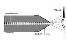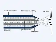 - ↑ Höcker O, Montealegre C, Neusüß C (August 2018). "Characterization of a nanoflow sheath liquid interface and comparison to a sheath liquid and a sheathless porous-tip interface for CE-ESI-MS in positive and negative ionization". Analytical and Bioanalytical Chemistry. 410 (21): 5265–5275. doi:10.1007/s00216-018-1179-3. PMID 29943266. S2CID 49409772.