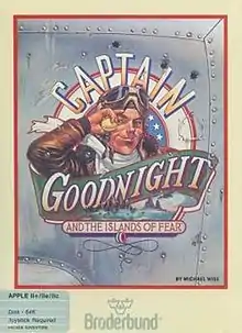 Captain Goodnight and the Islands of Fear is a 1985 action video game by Broderbund. It was released on the Apple II, in English and French.[1] The player must traverse air, sea and land in jets, jeeps, tanks, trams, boats, submarines, and on foot to advance toward enemy territory, the goal being deactivating the Doomsday Device on Doom Island. Along the way, enemy forces attempt to stop the captain.[2][3]
