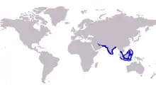 The brownback trevally is distributed in two distinct populations in the tropical waters of the Indo-west pacific region.[5] The western population extends from the waters of Iran in the Persian Gulf to the Bay of Bengal off Bangladesh, with records also from the Maldives and Sri Lanka. The eastern population inhabits a wide region in the South East Asian and Indonesian region, from the Gulf of Thailand to Borneo, Philippines and Indonesia.[2]