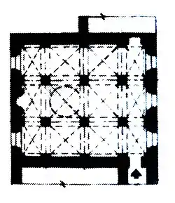 On the second floor of the building, a mosque was also built for the traders and guests, located on the corner of the building.[3] The three-nave prayer hall of the mosque was covered with an arched roof resting on eight octagonal columns, which is characteristic of Shusha architecture. The prayer hall measures 8.36x9.22 meters.[3]