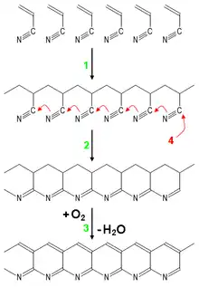 - Polymerization of acrylonitrile to PAN,