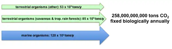 Graphic showing net annual amounts of CO2 fixation by land and sea-based organisms.
