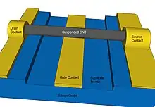 Yet another CNTFET device geometry involves suspending the nanotube over a trench to reduce contact with the substrate and gate oxide.[22] This technique has the advantage of reduced scattering at the CNT-substrate interface, improving device performance.[22][23][24] There are many methods used to fabricate suspended CNTFETs, ranging from growing them over trenches using catalyst particles,[22] transferring them onto a substrate and then under-etching the dielectric beneath,[24] and transfer-printing onto a trenched substrate.[23]