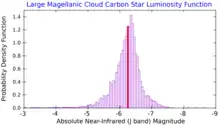 Classical carbon stars are very luminous, especially in the near-infrared, so they can be detected in nearby galaxies. Because of the strong absorption features in their spectra, carbon stars are redder in the near-infrared than oxygen-rich stars are, and they can be identified by their photometric colors.[15] While individual carbon stars do not all have the same luminosity, a large sample of carbon stars will have a luminosity probability density function (PDF) with nearly the same median value, in similar galaxies. So the median value of that function can be used as a standard candle for the determination of the distance to a galaxy. The shape of the PDF may vary depending upon the average metallicity of the AGB stars within a galaxy, so it is important to calibrate this distance indicator using several nearby galaxies for which the distances are known through other means.[14][16]