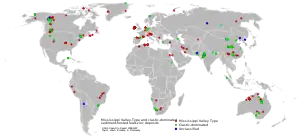 World-wide distribution of MVT deposits (red), clastic sediment-hosted (green), and unclassified (blue) lead-zinc deposits. Source: USGS