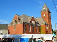 Carbondale City Hall and Courthouse, also known as the Carbondale Municipal Building, is a historic city hall and courthouse building located at Carbondale, Lackawanna County, Pennsylvania. It was built in 1892-1894, and is a brick and bluestone building in the Romanesque-style. It consists of five-story, square, corner tower; three-story wing; and two-story brick wing. The three-story wing, along with the tower, houses the Carbondale City Hall. It features a massive, half-circle primary entrance and rusticated stone and brick turrets. The two-story wing was built in 1859 as the courthouse, and incorporated into the new building.[2]