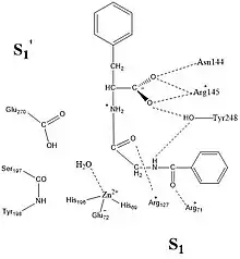 Glu-270 and Arg-127 play an important role in catalysis shown in Figure 2. Arg-127 acts to stabilize the carbonyl of the substrate that is bound to amino group of phenylalanine. Simultaneously, the water molecule coordinated to zinc is deprotonated by Glu-270 and interacts with the carbonyl stabilized by Arg-127. This creates an intermediate, shown in Figure 2, where the negatively charged oxygen is coordinated to zinc, and through unfavorable electrostatic interactions between Glu-270 and the ionized product facilitates the release of the product at the end of catalysis.[2]