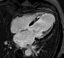 Cardiac magnetic resonance imaging (cardiac MRI, CMR), also known as cardiovascular MRI, is a magnetic resonance imaging (MRI) technology used for non-invasive assessment of the function and structure of the cardiovascular system.[2] Conditions in which it is performed include congenital heart disease, cardiomyopathies and valvular heart disease, diseases of the aorta such as dissection, aneurysm and coarctation, coronary heart disease. It can also be used to look at pulmonary veins.[3] Patient information may be found here.
