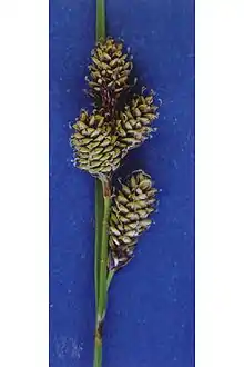 This sedge produces clumps of stems up to a meter-3 feet tall, often much shorter. The plant is variable in appearance, including in the appearance of its identifying characters, such as the scales on the flowers and the perigynia on the fruits. In general the spikes are oblong or cylindrical and dense with bicolored spikelets. The perigynium is greenish or purplish and has a short, rounded tip.