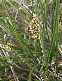 The inflorescence is a dense, somewhat cylindrical array of flower spikes up to 4 or 5 cm (1.6 or 2.0 in) long. The plant is often dioecious, with an individual bearing male or female flowers in its inflorescences, but not both. The range of this sedge is spreading, especially along roadsides where the application of road salt has apparently encouraged its growth.[3][4][5]