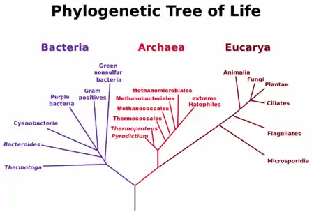 - ↑ Woese, C. R.; Fox, G. E. (1977). "The concept of cellular evolution". Journal of Molecular Evolution. 10 (1): 1–6. Bibcode:1977JMolE..10....1W. doi:10.1007/bf01796132. PMID 903983. S2CID 24613906.