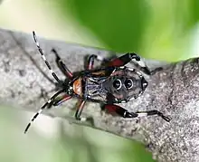The species shows a marked preference for the sap of Gardenia thunbergia and Gardenia volkensii, and its nymphs possess powerfully offensive scent glands to discourage predation or interference. This defensive secretion has been analysed and found to consist largely of acetic acid (66%), trans-2-hexenal (17%) and 3-hydroxybutanal (14%).[3] Even so the adults are eaten in Zimbabwe.[4] Nymphs of various Coreids secrete alarm pheromones from the dorsal abdominal glands.