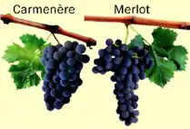 Genetic research has shown that Carménère may be distantly related to Merlot and the similarities in appearance have linked the two vines for centuries. Despite the similarities, there are some noticeable differences that aid the ampelographer in identifying the two vines. When young, Carménère leaves have a reddish hue underneath, while the leaves of Merlot are white. There are also slight differences in leaf shape with the central lobe of Merlot leaves being longer.[24] Merlot ripens two to three weeks earlier than Carménère.[1] In cases where the vineyards are interspersed with both varieties, the time of harvest is paramount in determining the character of the resulting blends. If Merlot grapes are picked when Carménère is fully ripe, they will be overripe and impart a "jammy" character. If the grapes are picked earlier when only the Merlot grapes have reached ripeness, the Carménère will have an aggressive green pepper flavor.[24]