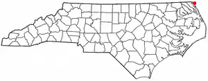 Carova Beach or Carova is an unincorporated community in Currituck County in the extreme northeastern corner of North Carolina, United States. The community, begun in the 1960s, is found on Currituck Banks, north of Bodie Island, and can be accessed only by boat or by four-wheel drive vehicle. There are no paved roads connecting Carova to the town of Corolla, North Carolina. The neighboring settlement of Sandbridge in Virginia Beach, Virginia, is not accessible by vehicle from Carova. In the 1960s, when development began in Carova, there were plans to construct a paved road from Sandbridge south to Carova through the Back Bay National Wildlife Refuge, but these never materialized. Today, there is a permanent fence from ocean to sound to keep vehicles from crossing and, more importantly, to keep the wild horses from migrating to the Virginia side of the border. To reach Carova, four-wheel drive vehicles must drive north along the beach from Corolla into the community, as access from Virginia is limited to pedestrians and bicyclists.