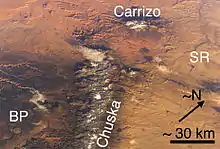 The Carrizo Mountains (36°50' N, 109°7'W) is a small, mostly circular mountain range 15 to 20 km (9 to 12 miles) in diameter located on the Colorado Plateau in northeastern Arizona. The range is about 20 km (12 mi) southwest of the Four Corners. The highest summit, Pastora Peak, is 2,869 m (9,413 ft) in elevation, whereas elevations on the surrounding plateau are near 1,800 m (5,900 ft).
