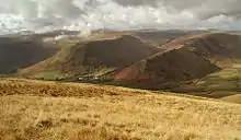 At the western end of these hills, near Dalmellington, there is an extensive area of forest called Carsphairn Forest which does not make for the most interesting walking territory. For the outdoor enthusiast there is however, a 23-kilometre cycle route through this forest (with some 250 metres of climbing).[3] For the alternative live music enthusiast there are "Twin Music Festivals" held bi-annually at Knockengorroch (OS Ref NX555972)[4] a "World Ceilidh" and a "Doonhame Hairth". Buses are run directly to the festivals from Glasgow and Edinburgh and the festivals take place 4 miles (6 km) into the hills off the already remote A713. To the east of Carsphairn Forest is where the highest hills in this whole hill area lie.