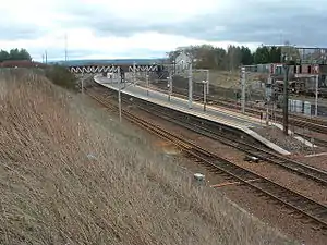 Network Rail temporarily closed the station from 4 March to 30 May 2023 as part of a major upgrade to the junction south of the station in order to make it more reliable and better able to cope with future passenger and freight demands.[13] New track sections, overhead lines, signalling and telecoms were installed, with improvements to station platforms, embankments and drainage across the junction.[14] This will see line speeds through Carstairs increased significantly, a freight loop capable of holding trains of up to 775 metres, as well as allow possibilities for the station to become more accessible in the future, as no step free access from platform to street is currently available.