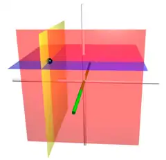The coordinate surfaces of the Cartesian coordinates (x, y, z). The z-axis is vertical and the x-axis is highlighted in green. Thus, the red hyperplane shows the points with x = 1, the blue hyperplane shows the points with z = 1, and the yellow hyperplane shows the points with y = −1. The three surfaces intersect at the point P (shown as a black sphere) with the Cartesian coordinates (1, −1, 1).