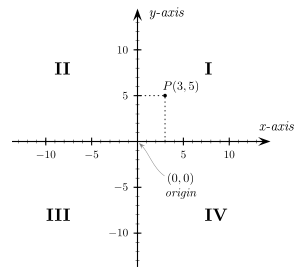A Cartesian coordinate system in two dimensions (also called a rectangular coordinate system or an orthogonal coordinate system[6]) is defined by an ordered pair of perpendicular lines (axes), a single unit of length for both axes, and an orientation for each axis. The point where the axes meet is taken as the origin for both, thus turning each axis into a number line. For any point P, a line is drawn through P perpendicular to each axis, and the position where it meets the axis is interpreted as a number. The two numbers, in that chosen order, are the Cartesian coordinates of P. The reverse construction allows one to determine the point P given its coordinates.