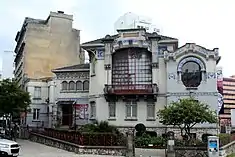In 1904, José Victor Branco Malhoa petitioned the municipal authority of Lisbon to construct a residence and atelier, based on a project by Manuel Joaquim Norte Júnior (1878-1962).[1] The March 1904 project was given to constructor Frederico Augusto Ribeiro, what was then known as the Lar-Oficina Pro-Arte.[2] As part of the late-18th century eclecticism, the design crossed many decorative elements of the Art Nouveau, that were brought into the Portuguese residence from the Parisian school.[2] The building suffered various alterations over time, since November 1904, with inclusion of a secondary floor and basement.[2] The serene modernity of the home was appreciated by José Malhoa, who hoped to win the Prémio Valmor, an award that (despite his fears that the opposition, Ventura Terra and Adães Bermudes) would be attributed to him.[3] The final design won a Prémio Valmor in 1905, composed of a jury that included José Luís Monteiro (CML), José Alexandre Soares (ARBA) and Arnaldo Redondo Adães Bermudes (SPA).[1]