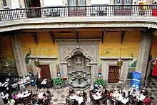 Early in the 20th century, Frank Sanborn and his brother Walter opened a small soda fountain/drugstore on Filomeno Mata Street in the historic center of Mexico City, calling it Sanborns American Pharmacy[2] In 1917, the two brothers saw the old mansion as a place to expand their business. They took two years to remodel it, putting a stained-glass roof over the main courtyard, putting in new floors and adding a peacock mural by Romanian painter Pacologue. A less important mural was painted by José Clemente Orozco in 1925 called Omnisciencia, solicited by his friend Francisco-Sergio (Paco) de Yturbe with the approval of the Sanborns brothers.[1] A restaurant covered the inner courtyard and now dominates the establishment, which now is the flagship site for a chain of restaurants called Sanborns.[9][12] The building was declared a national monument in 1931.[12] Since the early 20th century, this Sanborns has been a popular place to have a meal in luxurious surroundings.[9] The business has hosted painters, writers, actors, poets and revolutionaries. It was a symbol of a cosmopolitan atmosphere in the first half of the 20th century.[2] The building was restored again between 1993 and 1995 after suffering a minor fire on the second floor. This project was aimed at preserving the elements of the building dating from the Baroque period, the French and Art Nouveau elements of the late 19th and early 20th centuries, as well as the two murals, which had deteriorated considerably.[1] Sanborns currently belongs to billionaire Carlos Slim.