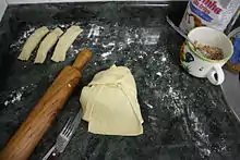The Casadiella is a typical dessert from Asturias. It consists of a pastry made of wheat flour, flavored with Anis de la Asturiana (Anise liquor) or wine, and filled with toasted hazelnuts or walnuts and sugar. They are mixed and they are fried together.[1] The final shape is a tube approximately ten centimeters long with ends that are closed with a fork.