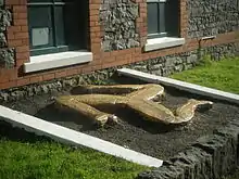 Also at the station, to the side of the goods shed in a gravelled raised section of the lawn is a large cast concrete Triskelion or Legs Of Mann at platform level, painted in a yellow and red colour scheme. It is believed that this piece was relocated from the long-closed stopping place at Peel Road on the Ramsey Line, and was relocated at some point prior to the closure of these other lines in 1968, and prior to 1975 when the Peel Road site was cleared. This feature originally had a gravel surround which was later replaced with grass. In 2012 the Friends Of... group restored the item, repainting it to a golden colour scheme with red gravelled surround to mimic the colourings on the national flag though it returned to its more familiar red, yellow and black setting in the spring of 2016. Originally the feature also had a large circular surround although this was beyond repair to be removed from the original site.