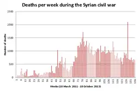 According to the pro-opposition Syrian Observatory for Human Rights, 162,390 civilians had been killed between March 2011 and March 2023. This number does not include an estimated 55,000 civilians killed in government prisons.[1]