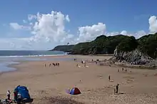 Caswell Bay (Welsh: Bae Cas-wellt; meaning: straw fortress), is a beach on the south east of the Gower Peninsula, Swansea, Wales. It is a sandy beach popular with families, holiday makers and surfers, and it regularly achieves Blue Flag status.