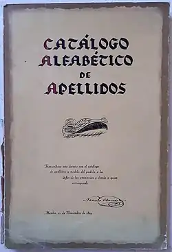 The Catálogo alfabético de apellidos (English: Alphabetical Catalogue of Surnames; Filipino: Alpabetikong Katalogo ng mga apelyido) is a book of surnames in the Philippines and other islands of Spanish East Indies published in the mid-19th century. That was in response to a Spanish colonial decree establishing the distribution of Spanish family names and local surnames among colonial subjects who did not have a prior surname. It is also the reason for Filipinos sharing some of the same surnames as many Spaniards and other Hispanic countries.[3]