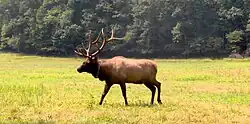 Elk were reintroduced into the park in February 2001 when 25 elk from the Land Between the Lakes National Recreation Area were released in Cataloochee. Most of the original $1.1 million cost was funded by the Rocky Mountain Elk Foundation, which provided $700,000.[34] Elk once roamed the highlands of Southern Appalachia, but were eliminated by overhunting and loss of habitat. Elk herds are a common sight in Cataloochee in the Spring and Fall. After the 2011 calving season the total population of elk in the park was estimated to be just over 130.[35]