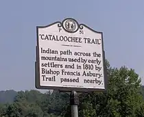 The Cataloochee Trail, which stretched from the Cove Creek area to what is now Cosby, Tennessee, connected the Cherokee Middlesettlements with the Overhill towns. The modern Cove Creek Road closely parallels this trail.[3] By the time the first European explorers and traders arrived, the trail had been worn a foot deep in some places. Bishop Francis Asbury used it to cross the mountains into Tennessee in 1810.