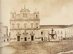 The Jesuits gathered to build a fourth church, the present structure, in 1654. The cornerstone of the present structure was laid in 1657 at a grand ceremony and mass. It was attended by Governor-General Jerónimo de Ataíde, the Conde de Atouguia (1610-1665) and numerous government and military figures. The mass was celebrated by Father Simão de Vasconcelos. The structure was completed in 1672. Its frontispiece dates to 1679 and its steeples were completed in 1694. The images of Saint Ignatius, Saint Francis Xavier, and Saint Francis of Borja were placed on the frontispiece in 1746. Housing for three religious communities, the father, the Escolásticas, and the Brotherhood; a smaller chapel; a refectory and kitchen; a novitiate; and a small school were completed soon after the opening of the church. The religious community numbered approximately 150, as evidenced by the seating of the domestic chapel. The novitiate was moved to the lower city in 1728 to the present-day Casa Pia and College of the Orphans of Saint Joachim.[4][2]