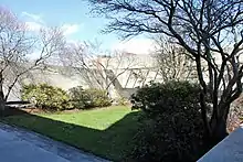 A good example of Brutalist architecture, St. Paul's Cathedral is built of exposed poured-in-place reinforced concrete, featuring a coffered sanctuary, textured surfaces from vertical formwork, and carefully proportioned and patterned joints.[4] The interior finishes include white oak furnishings and acoustic paneling and a slate floor. It is naturally lit from the skylights and a large curtain wall, which provides a view of Lake Champlain and the Adirondacks. The campanile holds eight bells from old St. Paul's. They were cast in 1895 by the Clinton H. Meneely Bell Company of Troy, New York.[5] The bells were refurbished after the fire and rehung in the new bell tower. A ninth bell cracked in the fire and is now at the foot of the tower, adjacent to the Memorial Garden gate. The Memorial Garden is located to the east of the church. The ashes of parish members and friends of St. Paul's are buried there. It is enclosed with stonework that incorporates stones from old St. Paul's.