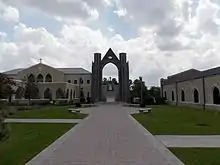 The architecture expresses elements found in the Gothic-inspired buildings of the 12th to 16th centuries.[8] These include pointed arches and sloping roofs in the church's exterior and shrine areas.