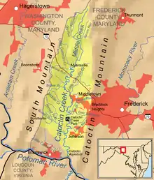Catoctin Creek is a 27.9-mile-long (44.9 km)[1] tributary of the Potomac River in Frederick County, Maryland, USA. Its source is formed north of Myersville. In Myersville, it merges with the Little Catoctin Creek at Doub's Meadow Park.[2] From there, it flows directly south through Middletown, and Frederick for the entire length of the stream collecting several smaller tributaries. It makes a crossing with the Chesapeake and Ohio Canal at the Catoctin Aqueduct, one of just 11 of these structures to survive.[2] Catoctin Creek enters the Potomac River east of Brunswick.